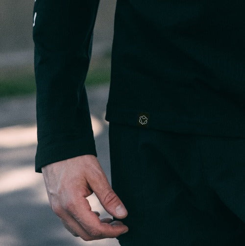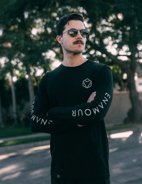 Black long sleeve shirt with the Enamour symbol on left chest and Enamour logo on both sleeves + custom woven hem tag.